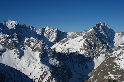 Von der Hütte kurze Abfahrt (ca. 100hm) in das westlich gelegene Tal. Gerade aus und dann links über Moränen zum Glacier de la Plate des Agneaux. Man folgt nicht dem Sommerweg zum Refuge Adèle Planchard, sondern folgt weiter dem Tal, bis rechts zwei steile Rinnen hochziehen. Man steigt zuerst durch die rechte hoch und wechselt dann dort, wo sie wieder aufeinandertreffen in die linke Rinne. Ziemlich gerade hoch, bis die Schutzhütte sichtbar wird. Dann quert man nach links und steigt über einen steilen Gletscherhang Richtung Col des Neiges (3348m). Kurz vor dem Pass nach Rechts hoch und durch das zuerst flacher, dann wieder steiler werdende Gletscherbecken hoch zur Scharte zwischen dem Hauptgipfel und dem Pic Maître. Skidepot. Oberhalb der Randspalte nach links bis zu einer steilen Rinne, die zum Grad führt. Hier hinauf und noch kurz über den Grat zum Gipfel (3765m)